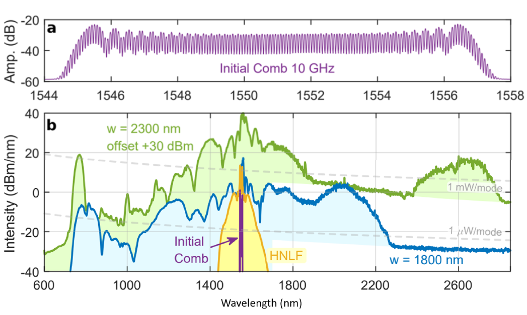 (上圖)EO Combs的頻譜,可見10 GHz梳齒。(下圖)綠色和藍(lán)色的線顯示了在納米光子波導(dǎo)中展寬后的EO梳狀譜